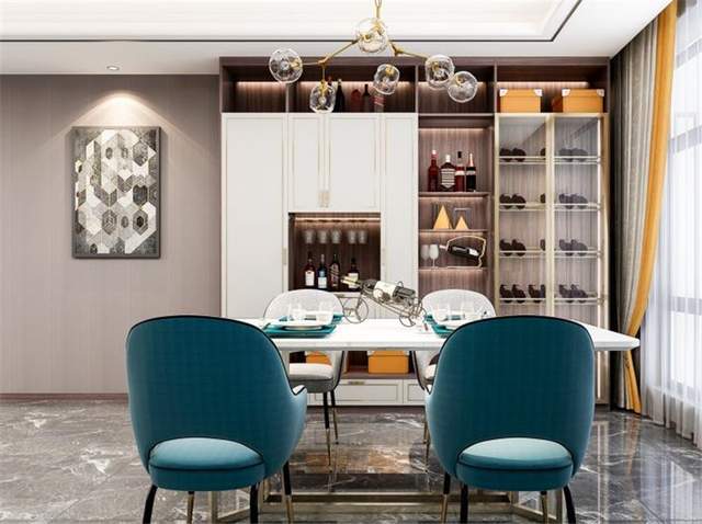 如果擔心到頂柜太過壓抑,可以適當加入通透的玻璃柜門,柜內(nèi)藏酒還有裝飾作用,作為餐廳的亮麗風景線。